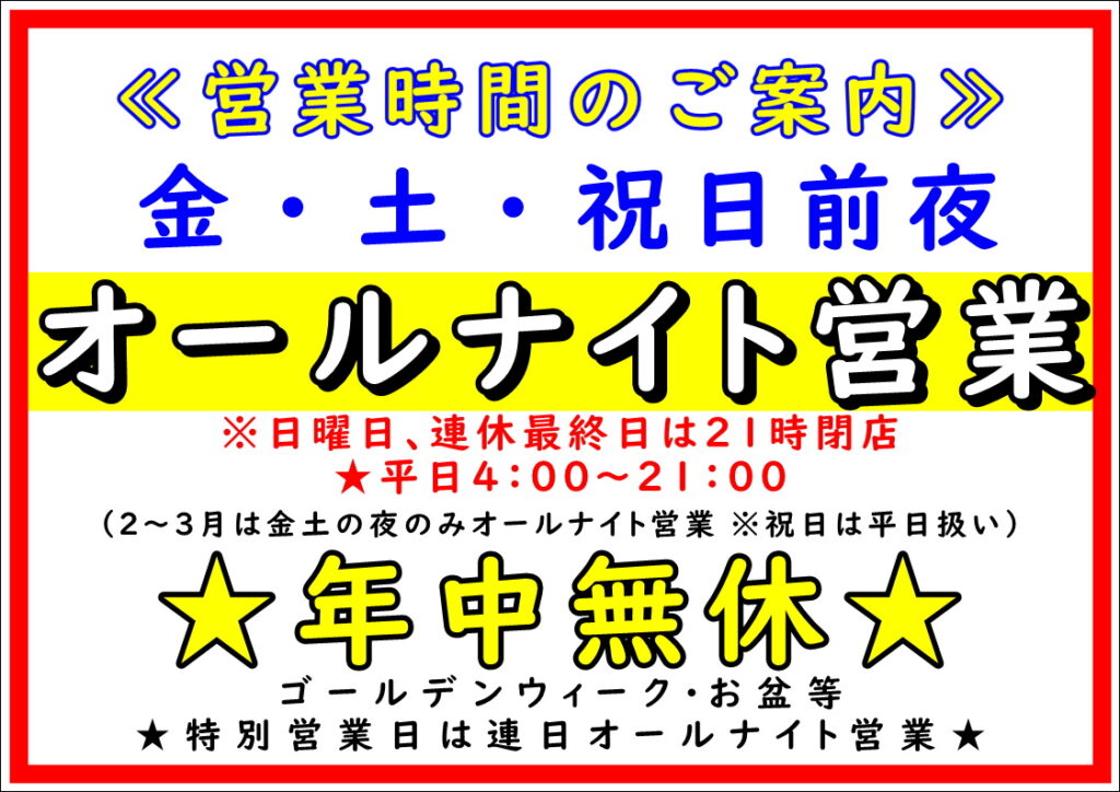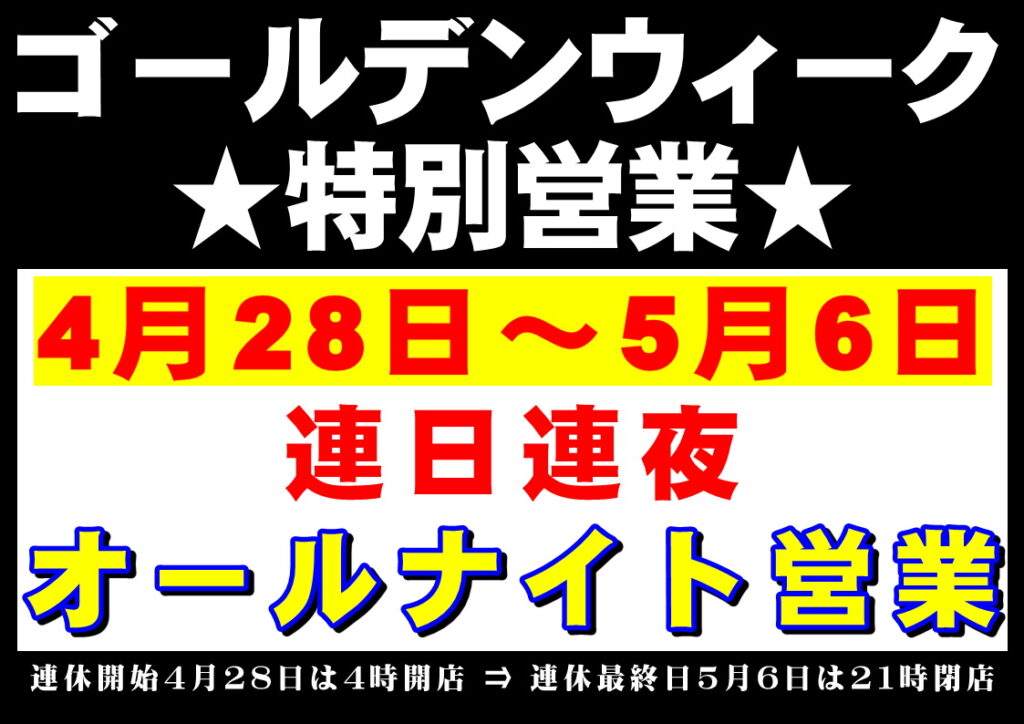 お知らせ 2026.04.27 GW特別営業 2026.04.28 ~ 05.06 MiC天津(あまづ)店、ゴールデンウィーク特別営業のご案内4月28日(火) 4時開店 ~ 5月6日(水) 21時閉店まで、連日オールナイト営業~!サーフルアー、アオリイカ、キス釣り開幕!潮干狩りも好調!渥美半島へお越しの際は、ぜひお立ち寄りくださいね!地域密着商材多数。消耗品は年中大特価!ルアー各種、メーカー竿、リールも特価販売中! ◎連休以外も、金、土、祝日前夜はオールナイト営業!◎平日は早朝4時開店!◎年中無休 お知らせ オールナイト営業, 2026, GW, 営業時間 MiCダービー結果、要項 & イベント結果まとめ 前の記事 TOYO-PAY(とよっペイ) 2026.05.01~ 次の記事